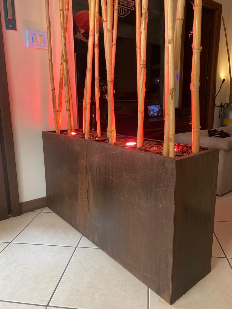 Complemento d’arredo vaso porta bambù. Realizzato in metallo effetto ruggine graffiato. Dona un’impronta moderna e industrial agli ambienti domestici e uffici.