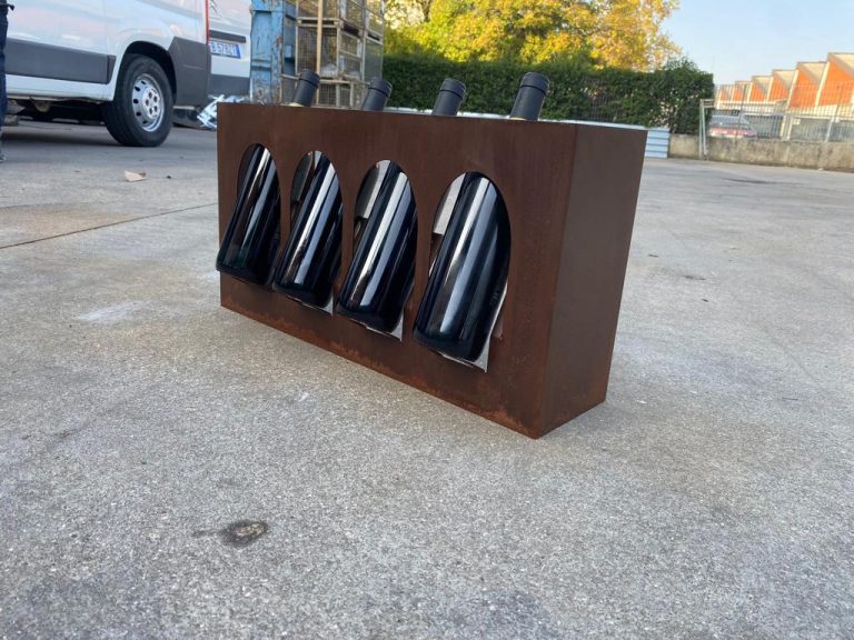 Portabottiglie in metallo con effetto ruggine. Un pezzo di design che unisce praticità ed originalità.