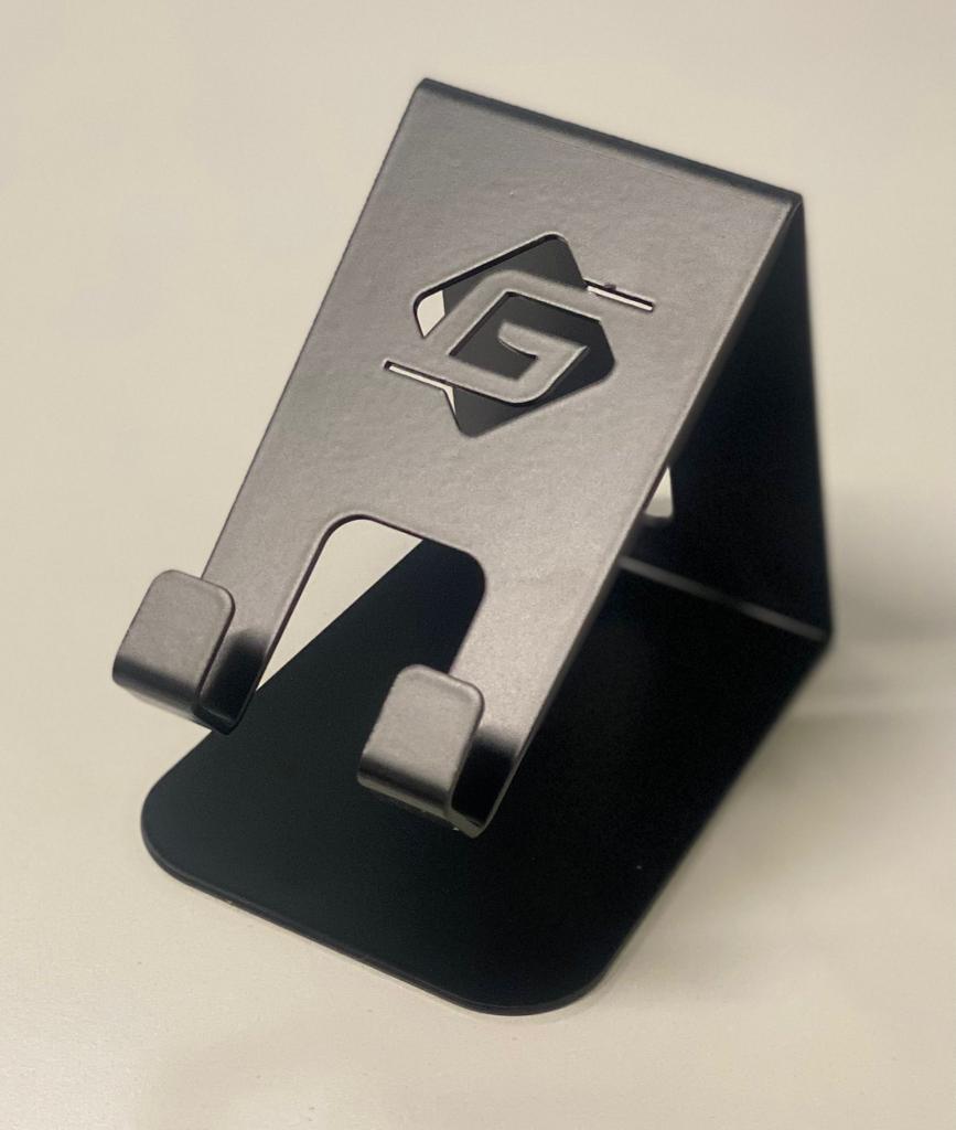 Porta cellulare/porta tablet, realizzati tramite piegatura della lamiera, con bordi definiti e arrotondati. Il logo è stato intagliato mediante laser.